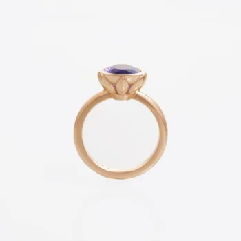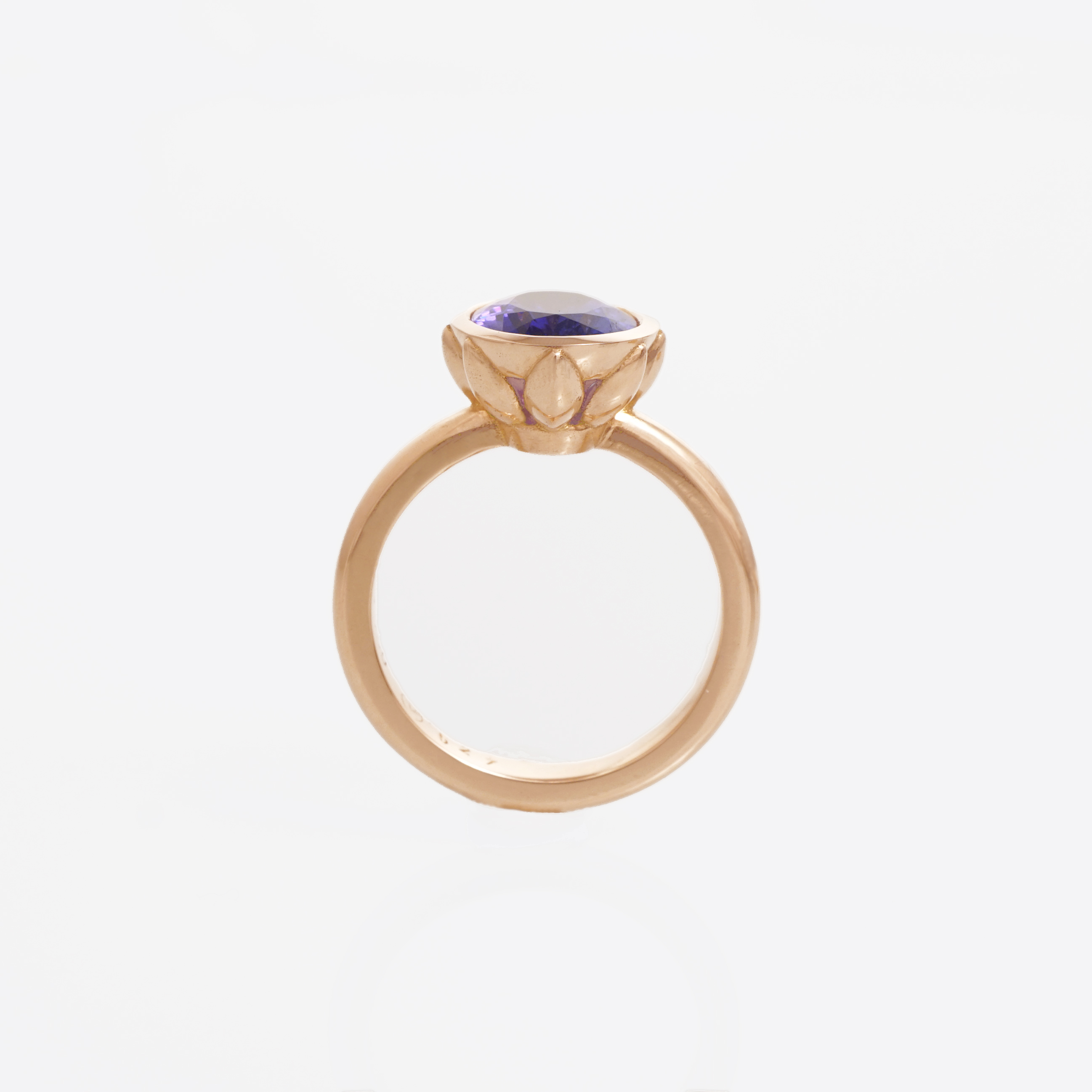 Like an open flower, the four filigree leaves hold the stone suspended. The precious sapphire is held securely by a delicate frame in a filigree setting, open at the side, and sparkles magnificently in its bright blue.